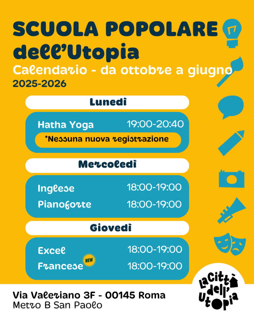 Ogni anno, divers* volontar* mettono a disposizione il loro tempo e le loro competenze organizzando corsi ed attività educative. Le lezioni di yoga, meditazione, lingue, pianoforte ed altre hanno riempito La Città dell’Utopia in tutti questi anni.